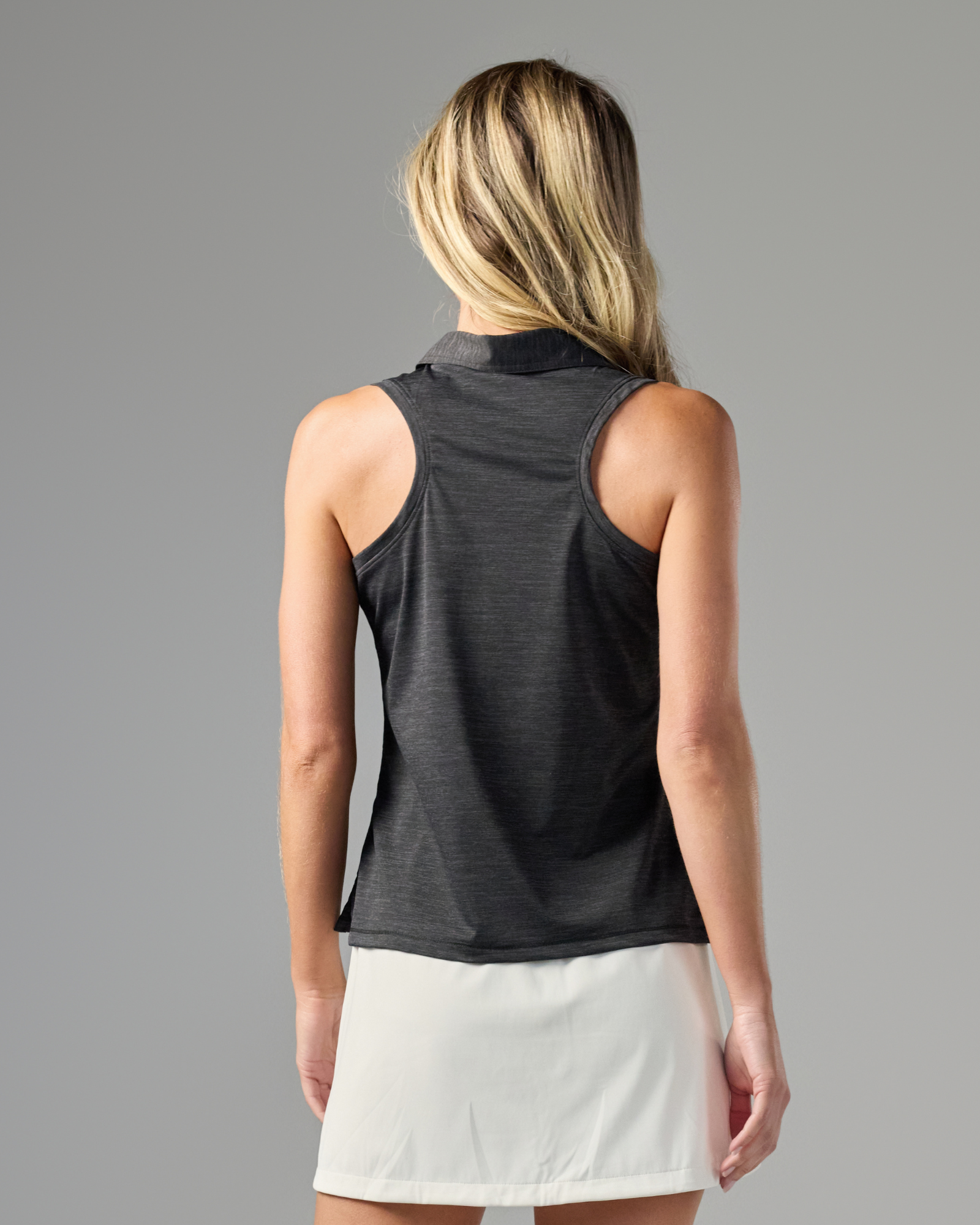 Made to move and made to turn heads, the Statement Polo blends a sleek, sleeveless silhouette with performance-ready stretch. The heathered fabric adds subtle texture and a soft grey hue, giving this piece a polished look that feels as effortless as it is breathable.
